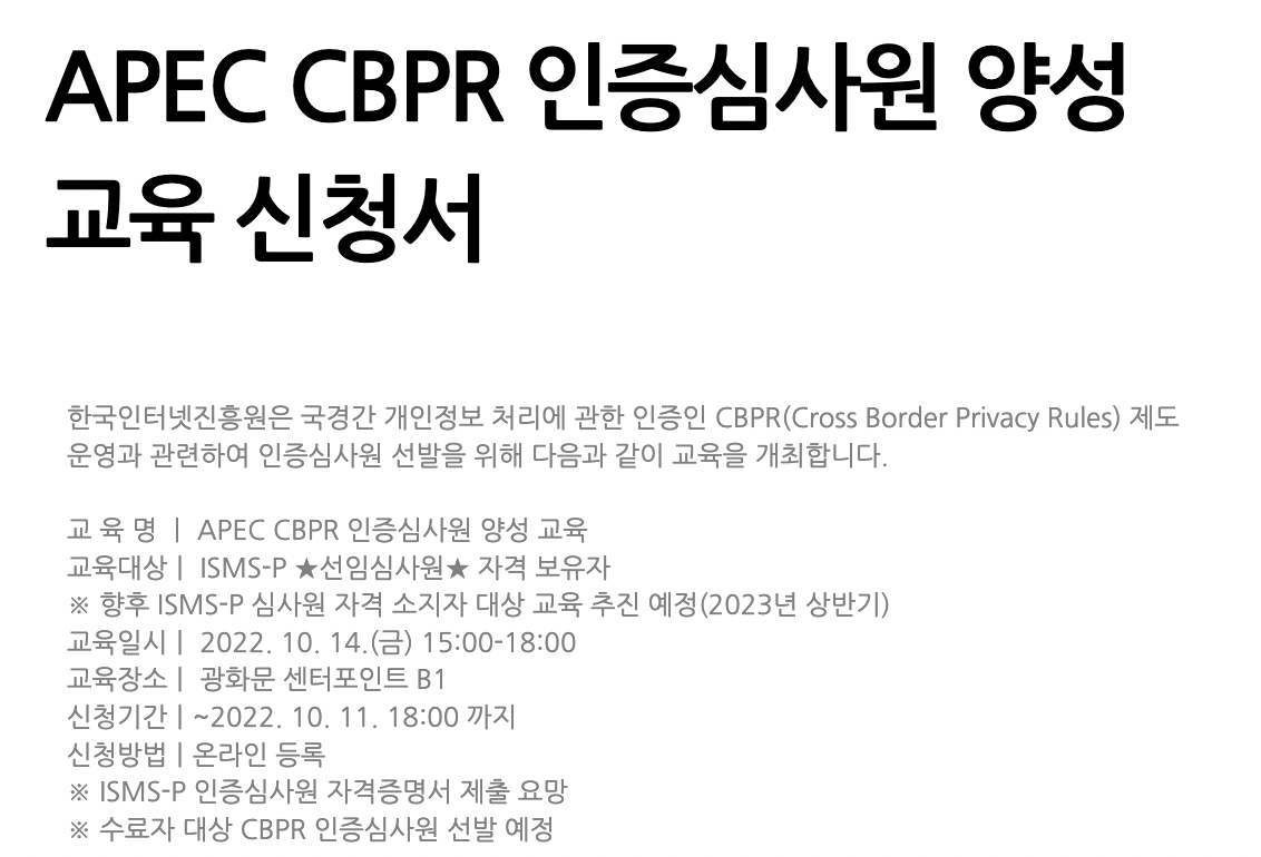 ISMS-P 심사원 중 교육을 통해서 APEC CBPR 인증 심사원을 뽑을 계획인데 아마도 ISMS-P 보다 더 많은 인력 부족 현상을 겪게 될 거라 생각한다.