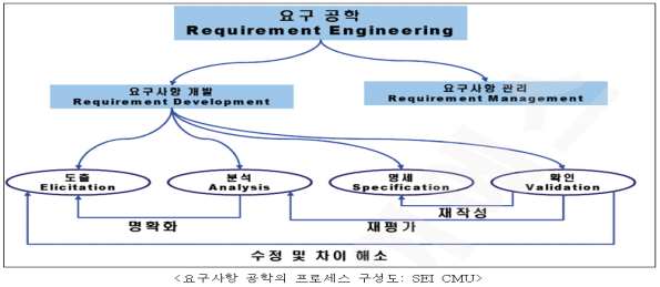 요구사항 검증 | - 문제를 기술하고, 서로 다른 부분들과 일치 여부를 확인함 - 점검항목 : 유효성, 일관성, 완전성, 실현성, 증명가능성 - 검증방안 : 문서화, 시험, 인증 |