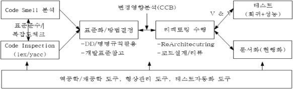 - 프로그램 소스의 기능은 유지하고 소스코드의 내부를 수정, 보완하여 유지보수 생산성을 높이는 기법
