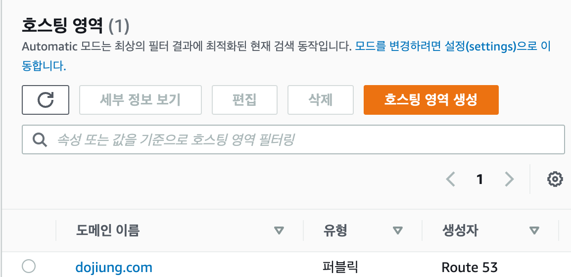 - 호스팅 영역에서 도메인 이름 클릭 -> 구입한 dojiung.com 클릭