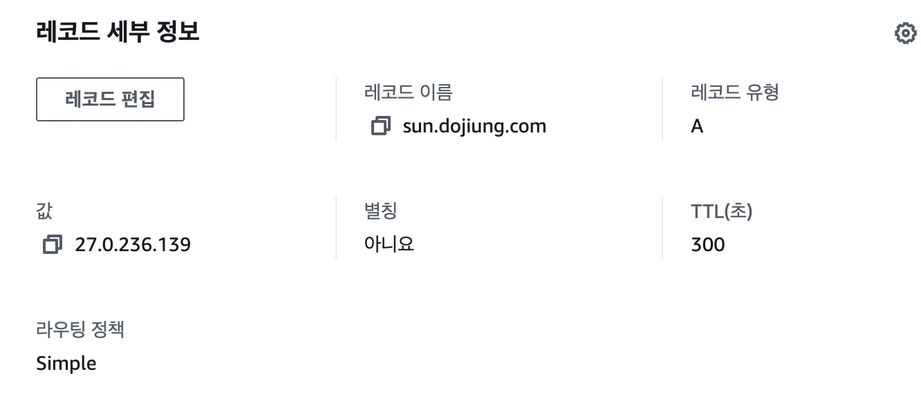 - dojiung.com과 같이 sun.dojiung.com을 A코드로 생성하면 된다. 마찬가지로 티스토리로 보내기 때문에 27.0.236.139 IP는 동일하다.