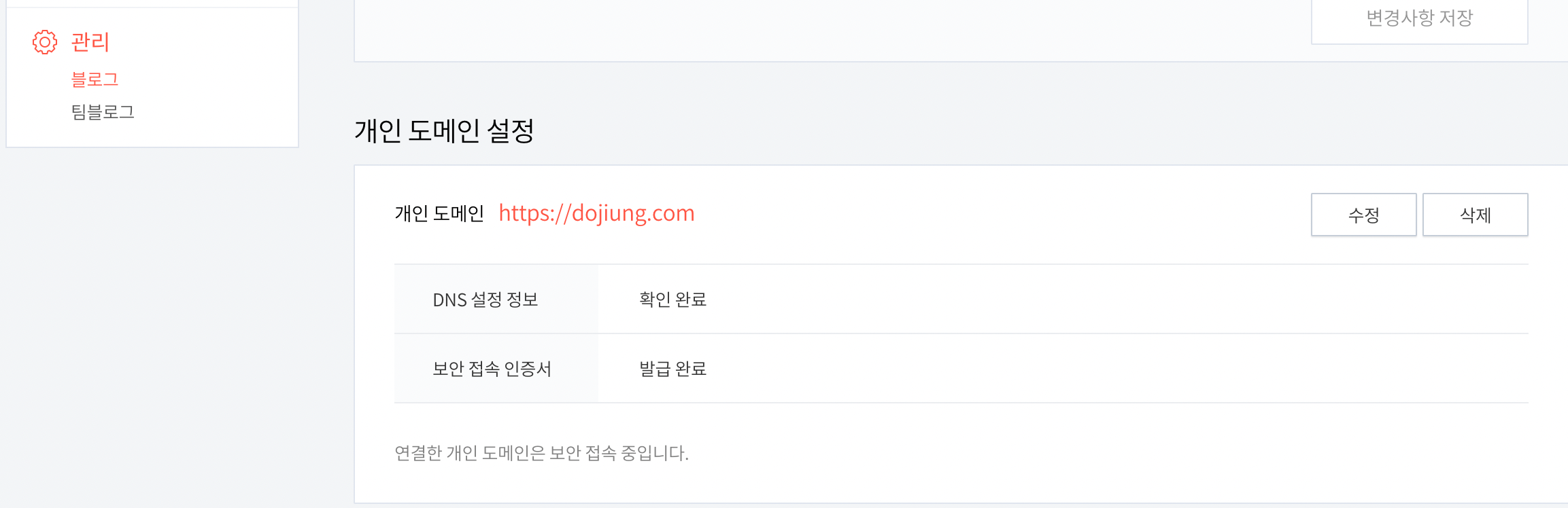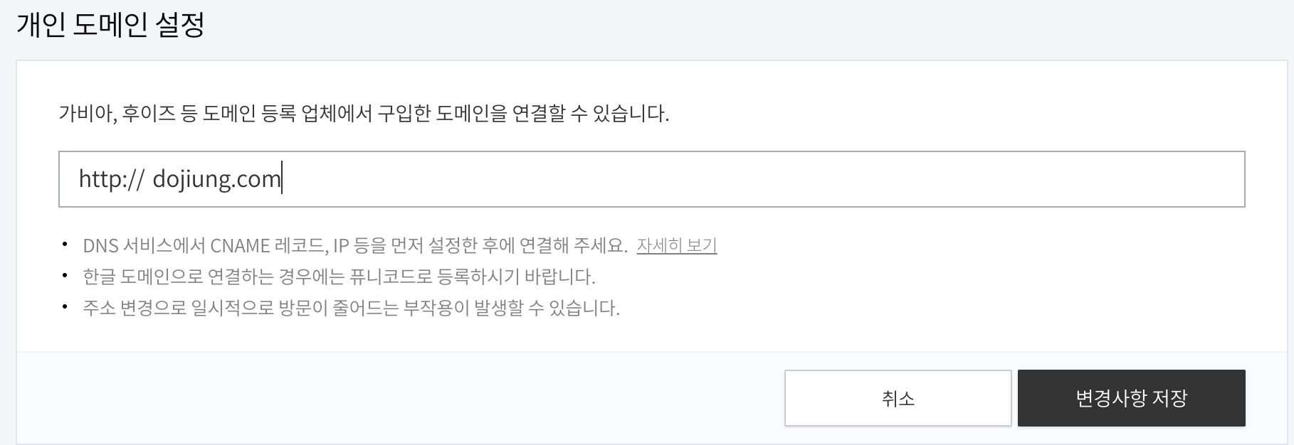 - 개인 도메인 설정에 dojiung.com 입력 후 변경 사항 저장