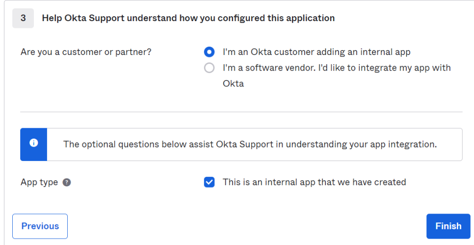 - Are you a customer or partner? 항목에 I'm an Okta customer adding an internal app 옵션 선택