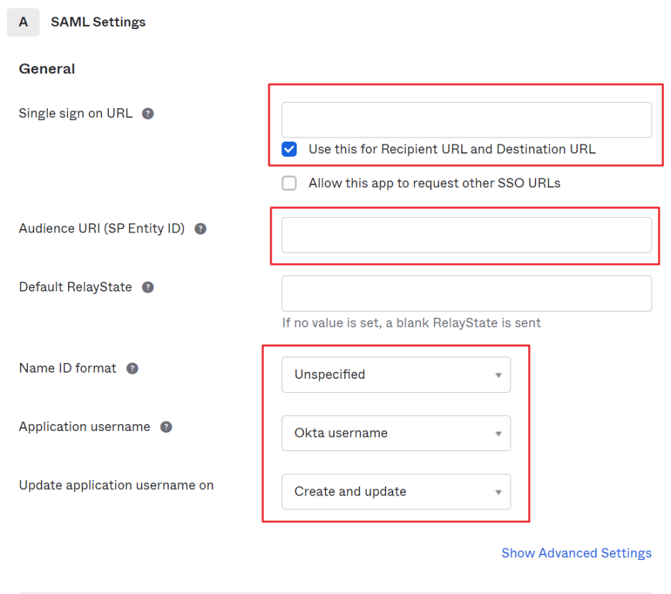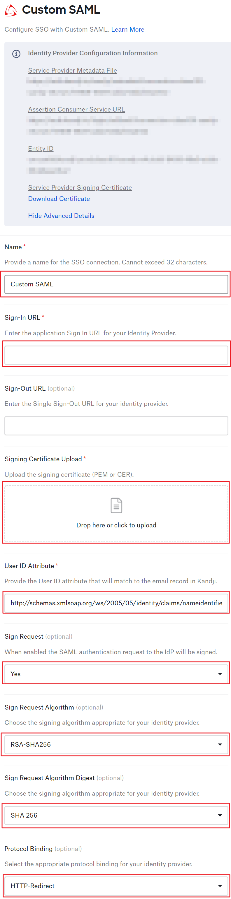 - Sigle sign on URL 항목에 해당 가이드 1번의 Kandji SAML 정보 입력